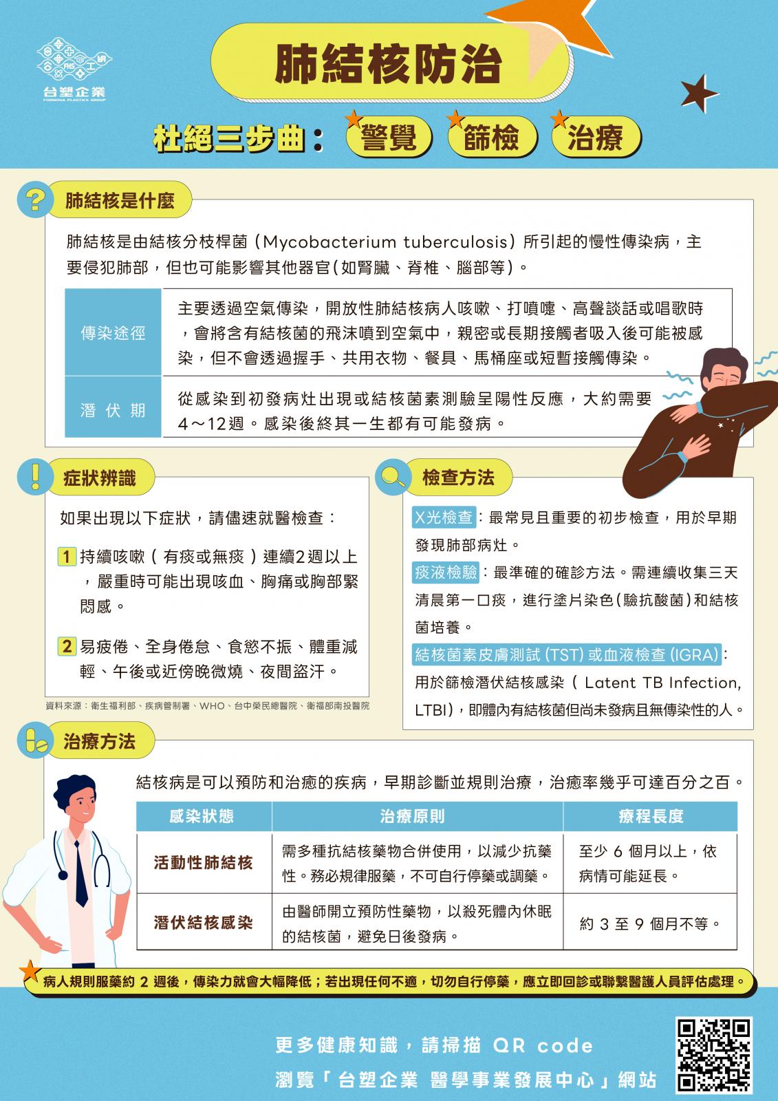 #結核分枝桿菌、慢性傳染病、空氣傳染、咳嗽、打噴嚏、高聲談話、唱歌、飛沫、持續咳嗽 (有痰或無痰)、咳血、胸痛、胸部緊悶感、易疲倦、全身倦怠、食慾不振、體重減輕、午後或近傍晚微燒、夜間盜汗、X光檢查、痰液檢驗、結核菌素皮膚測試 (TST) 、血液檢查 (IGRA)
