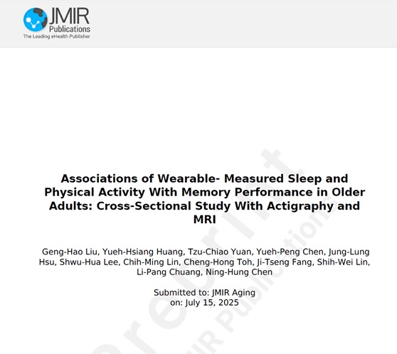本中心與林口長庚醫院腎臟科方基存教授等多位臨床專家共同組成研究團隊,最新研究成果已由長庚醫院劉耕豪醫師與陳濘宏教授團隊於2025年11月19日正式發表在國際學術期刊《JMIR Aging》(ImpactFactor:4.8)上。這項研究利用穿戴式裝置的客觀數據,揭示了老年人提升記憶力、延緩認知老化的兩大關鍵生活習慣:輕度身體活動(LPA)和持續不間斷的睡眠(低入睡後清醒時間(WASO))