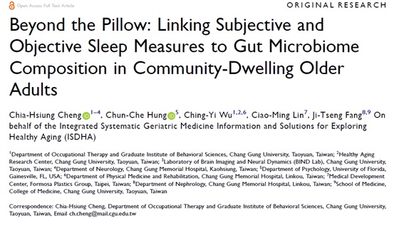 本中心與林口長庚醫院腎臟科方基存教授等多位臨床專家共同組成研究團隊,最新研究成果已由長庚大學健康老化中心鄭嘉雄教授與吳菁宜教授團隊於2025年10月14日正式發表在國際學術期刊《Nature and Science of Sleep》上。這項研究發現老年族群睡得好不好,跟腸道裡的細菌有關!